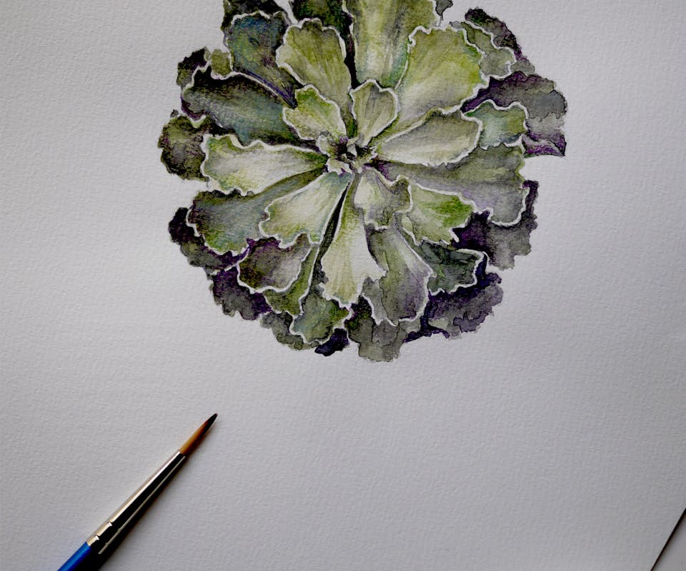 To enhance the natural and handcrafted aspect of the product, we painted a custom illustration for the packaging with watercolours. The subject of the painting was — unsurprisingly — a succulent in the brand's olive and purple shades. We applied this floral likeness onto the sleeve, as well as the inside lining of the box.