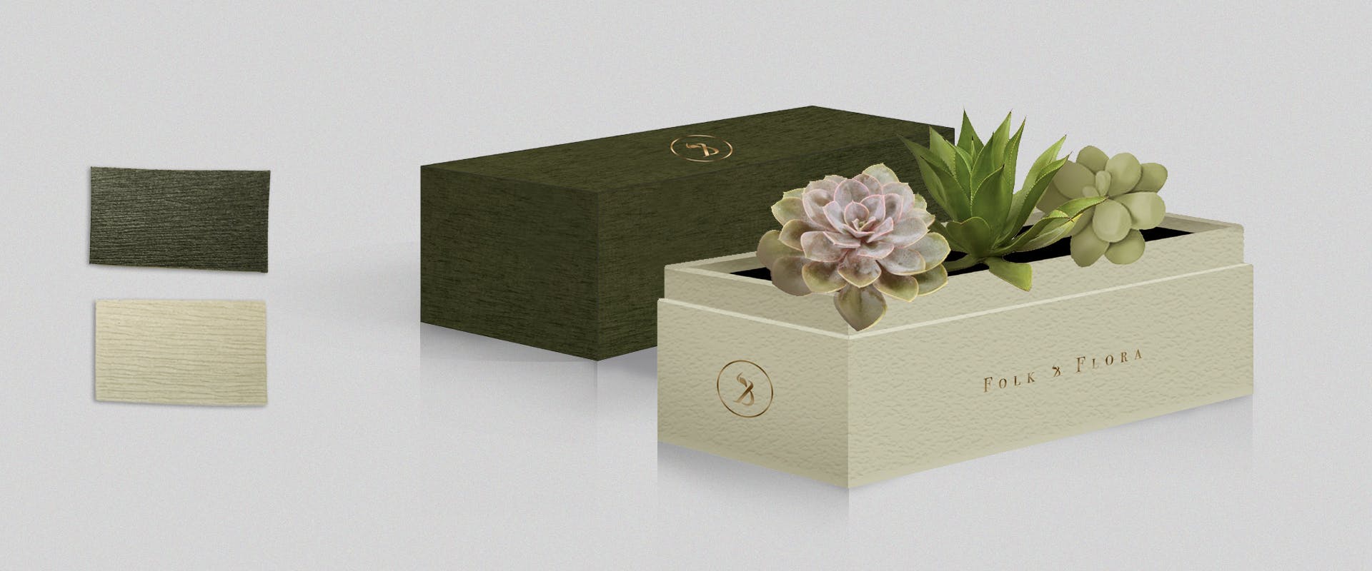 For Folk & Flora's succulent gift boxes, we designed a simple packaging wrapped in French crepe paper. The brand's logo and monogram are stamped in foil on various locations. We also decided on olive green, cream, purple and gold as the brand colours.