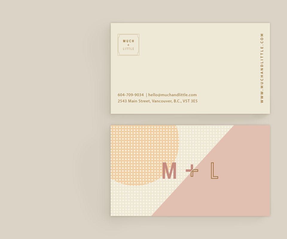 For the M&L business cards, we used minimal shapes and the M&L brand colours to highlight the concept of "Much" and "Little". The "Much" side is depicted by fun patterns, while the "Little" side is a simple solid tone.