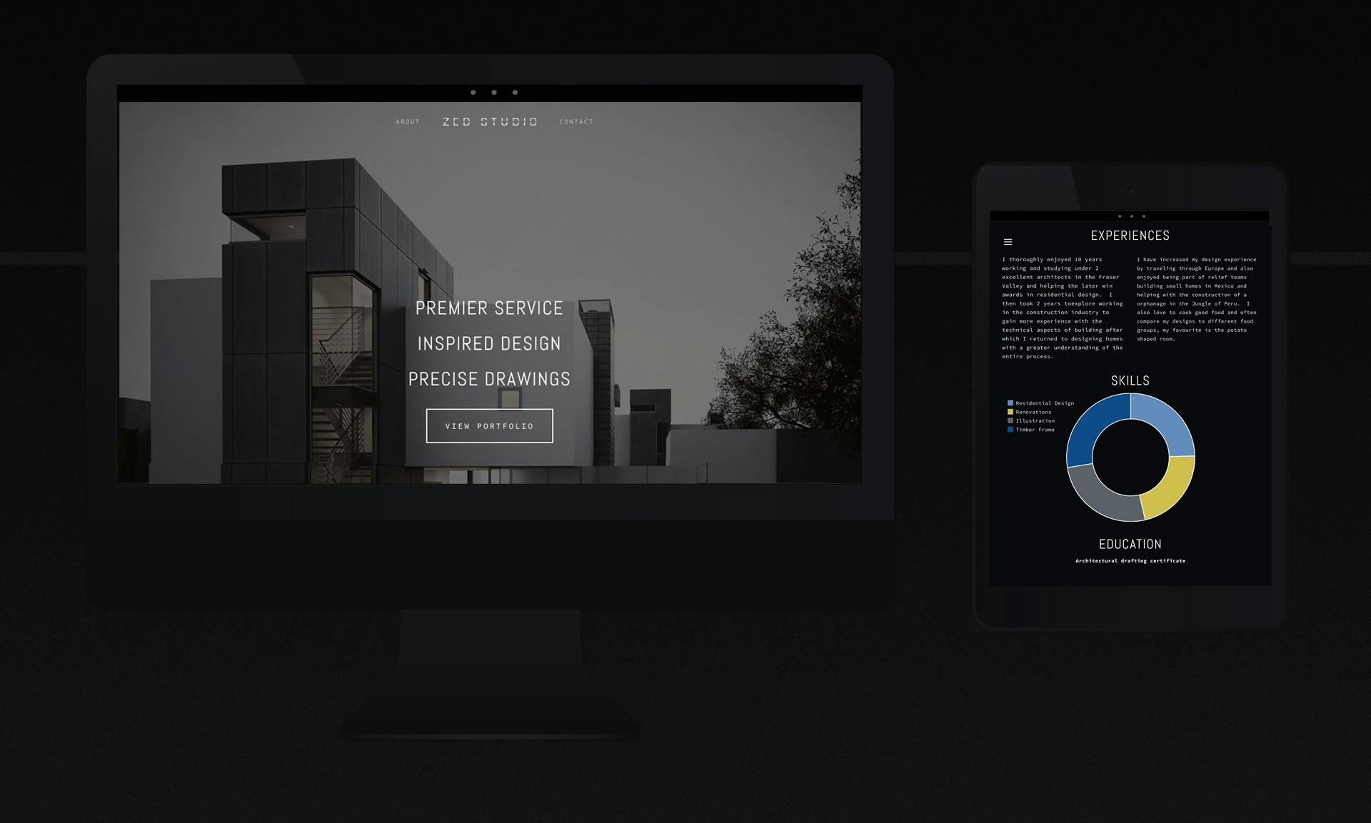 Continuing with our skylight theme, we designed a white-on-black color scheme for the website. The design was kept simple, minimal and contemporary. We also created diagrams and infographics to illustrate Zane's extensive design background.